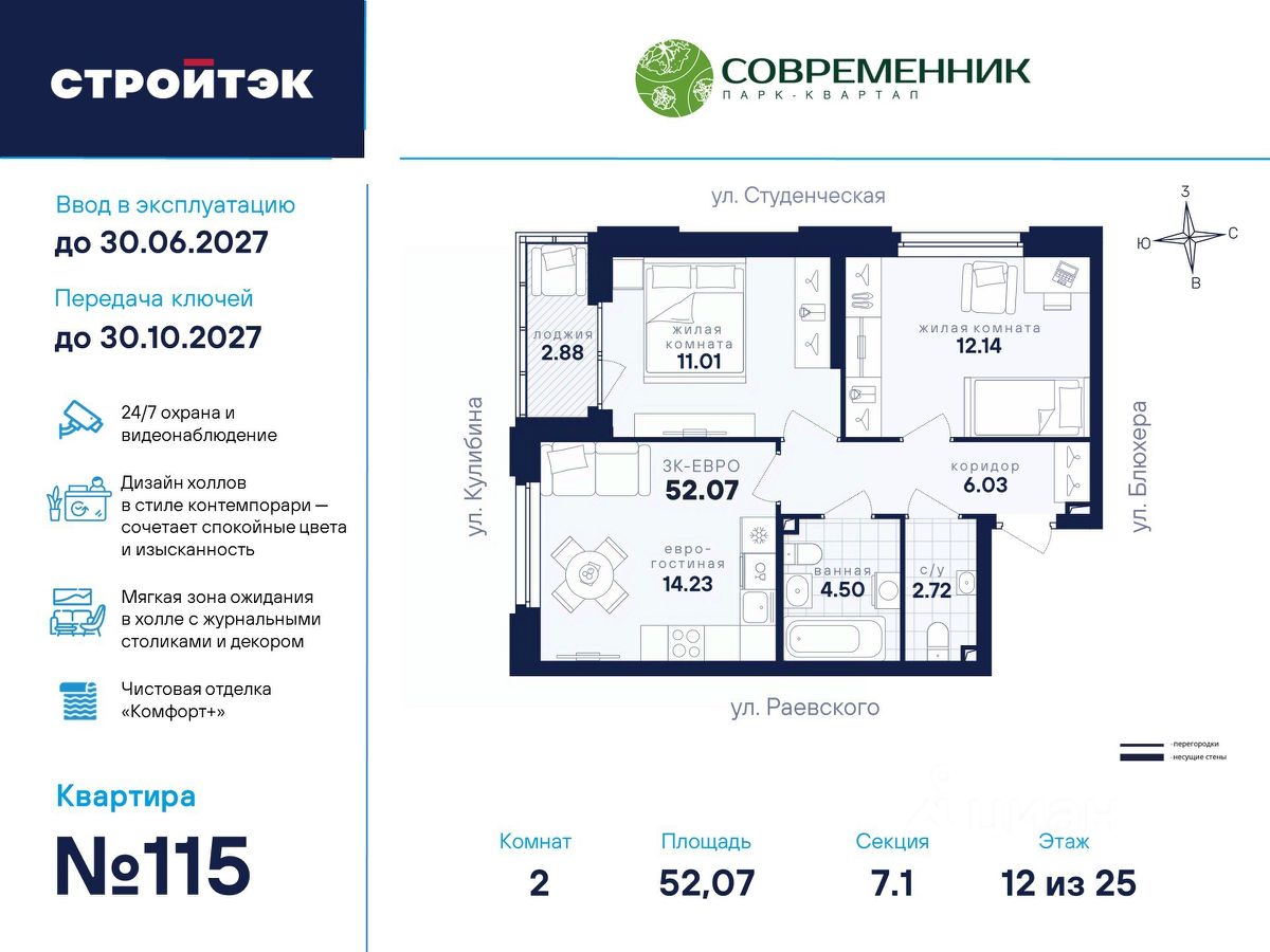 Время жить счастливо Современник — знаковый парк-квартал в интеллигентном районе Втузгородок, откуда недалеко до центра, а вблизи ведущие вузы и театры. Квартал состоит из 8 очередей строительства. Шесть очередей уже сданы и заселены; седьмая строится. В продаже квартиры от застройщика: 1 этап седьмой очереди. Объединяет квартал большой внутренний парк площадью в гектар — богатый прогулочными маршрутами, тенистыми деревьями, пространствами для отдыха, спорта и детских игр. С внешней стороны, у домов седьмой очереди, появится гостевой центр. Проект создавали в KCAP Architects and Planners, архитектурном бюро из Нидерландов, чьи работы украшают ландшафты Гамбурга, Антверпена и других городов Европы. Технологии, продуманное пространство и трендовый облик зданий создают размеренную атмосферу для жизни здесь. Достойное окружение До проспекта Ленина на машине вы доберётесь за 10 минут, а с другой стороны, неподалёку — Шарташский лесопарк с озером Шарташ, которому около миллиона лет. Здесь для вас пляжи, лодочные станции, тропы для бега и кафе. В квартале уже работают супермаркеты, пекарни, салон красоты и не только. Ближние школы, гимназии и университеты помогут расправить крылья новым поколениям, а детские сады станут заботливой средой в начале пути. Кстати, на территории квартала спроектирован муниципальный детский сад на 200 мест. Выходите во двор Гуляйте по зелёным аллеям или устройтесь с книгой в гамаке. Займитесь воркаутом, футболом, баскетболом или пинг-понгом. Проводите семейные праздники под крытым амфитеатром или отправьте детей играть на насыщенный плейхаб. Мы всё предусмотрели. На закрытой территории без машин и посторонних спокойно и безопасно. Видеонаблюдение и освещение добавляют ещё больше уверенности. Впечатляющая доминанта у домов 7 очереди — новый гостевой центр: камерное пространство под навесом-перголой с озеленением и скамейками, чтобы встречать друзей. Ваша зона комфорта Стильное лобби Современника мы выполним в эстетике contemporary: минимализм, сочетание дерева со штукатуркой и тёмным металлом, зеркала, витражи. Обстановка из мягкой мебели, растений и книг. Двери из холла выходят на обе стороны. Внутри — комната для колясок и самокатов. На -1 этаже подземный паркинг с 201 машино-местом, куда легко попасть на лифте прямо с вашего этажа. Здесь же можно приобрести одну из 67 кладовых, чтобы хранить сезонный инвентарь. СТРОЙТЭК возводит 7 очередь в 3 этапа. Дом с привилегиями Первый этап — секция 7.1, башня в 25 этажей. Здесь 246 квартир в 19 уникальных планировках от студий до 3-комнатных, в классических и евро-вариантах. Просторные кухни-гостиные, гардеробные и окна на 2 стороны — лишь часть их плюсов. В Современнике улучшенный стандарт отделки "Комфорт +". Помимо комфортных сантехники и электрики, в него входят оконные стёкла Energy Light, которые помогают сохранять температуру, прочный ламинат 33 класса и устойчивые к многократной покраске виниловые обои. Белые межкомнатные двери и плинтусы подчеркнут любую цветовую гамму.