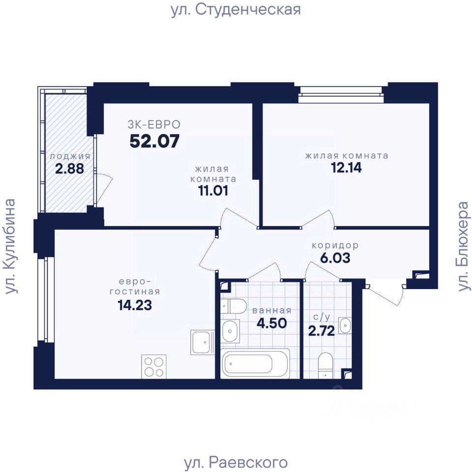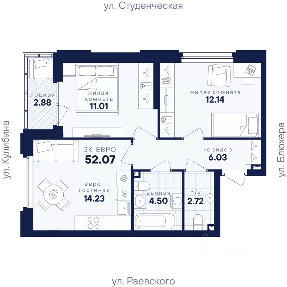 Общая площадь52,07 м²