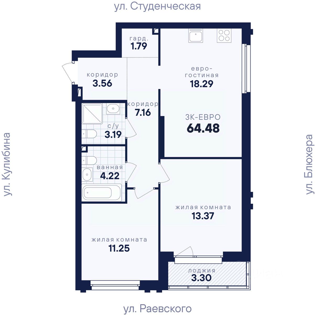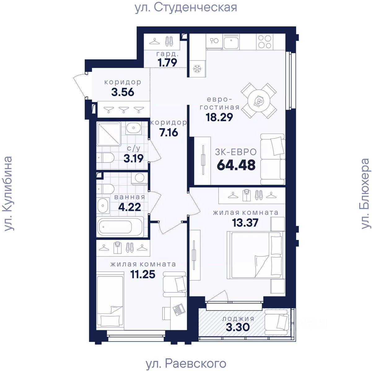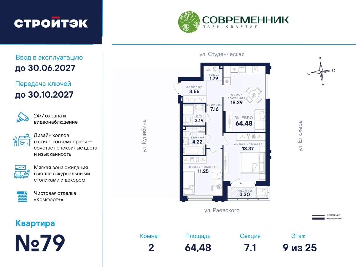 Первый этап — секция 7.1, башня в 25 этажей. Здесь 246 квартир в 19 уникальных планировках от студий до 3-комнатных, в классических и евро-вариантах. Просторные кухни-гостиные, гардеробные и окна на 2 стороны — лишь часть их плюсов.