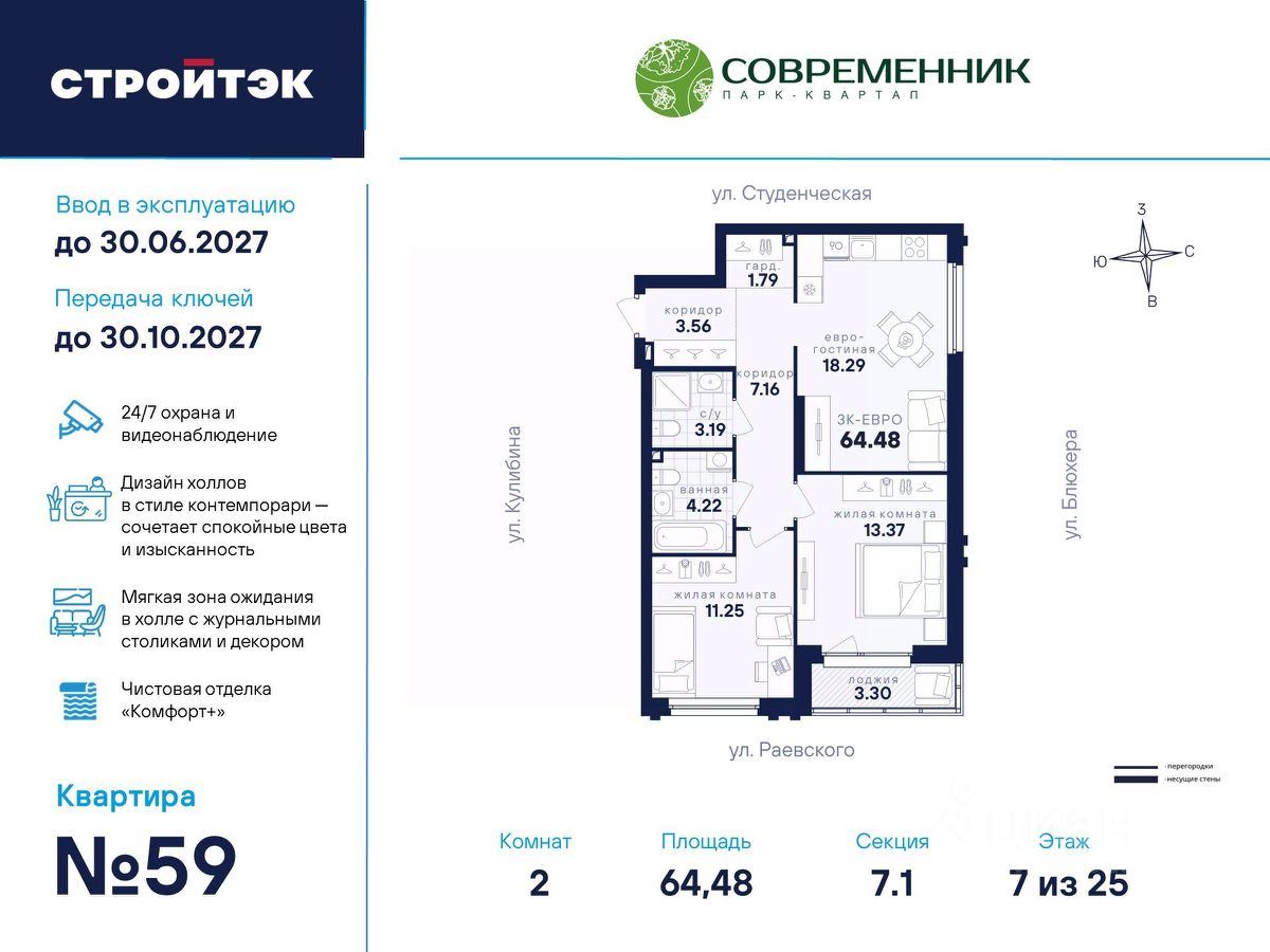 Время жить счастливо Современник — знаковый парк-квартал в интеллигентном районе Втузгородок, откуда недалеко до центра, а вблизи ведущие вузы и театры. Квартал состоит из 8 очередей строительства. Шесть очередей уже сданы и заселены; седьмая строится. В продаже квартиры от застройщика: 1 этап седьмой очереди. Объединяет квартал большой внутренний парк площадью в гектар — богатый прогулочными маршрутами, тенистыми деревьями, пространствами для отдыха, спорта и детских игр. С внешней стороны, у домов седьмой очереди, появится гостевой центр. Проект создавали в KCAP Architects and Planners, архитектурном бюро из Нидерландов, чьи работы украшают ландшафты Гамбурга, Антверпена и других городов Европы. Технологии, продуманное пространство и трендовый облик зданий создают размеренную атмосферу для жизни здесь. Достойное окружение До проспекта Ленина на машине вы доберётесь за 10 минут, а с другой стороны, неподалёку — Шарташский лесопарк с озером Шарташ, которому около миллиона лет. Здесь для вас пляжи, лодочные станции, тропы для бега и кафе. В квартале уже работают супермаркеты, пекарни, салон красоты и не только. Ближние школы, гимназии и университеты помогут расправить крылья новым поколениям, а детские сады станут заботливой средой в начале пути. Кстати, на территории квартала спроектирован муниципальный детский сад на 200 мест. Выходите во двор Гуляйте по зелёным аллеям или устройтесь с книгой в гамаке. Займитесь воркаутом, футболом, баскетболом или пинг-понгом. Проводите семейные праздники под крытым амфитеатром или отправьте детей играть на насыщенный плейхаб. Мы всё предусмотрели. На закрытой территории без машин и посторонних спокойно и безопасно. Видеонаблюдение и освещение добавляют ещё больше уверенности. Впечатляющая доминанта у домов 7 очереди — новый гостевой центр: камерное пространство под навесом-перголой с озеленением и скамейками, чтобы встречать друзей. Ваша зона комфорта Стильное лобби Современника мы выполним в эстетике contemporary: минимализм, сочетание дерева со штукатуркой и тёмным металлом, зеркала, витражи. Обстановка из мягкой мебели, растений и книг. Двери из холла выходят на обе стороны. Внутри — комната для колясок и самокатов. На -1 этаже подземный паркинг с 201 машино-местом, куда легко попасть на лифте прямо с вашего этажа. Здесь же можно приобрести одну из 67 кладовых, чтобы хранить сезонный инвентарь. СТРОЙТЭК возводит 7 очередь в 3 этапа. Дом с привилегиями Первый этап — секция 7.1, башня в 25 этажей. Здесь 246 квартир в 19 уникальных планировках от студий до 3-комнатных, в классических и евро-вариантах. Просторные кухни-гостиные, гардеробные и окна на 2 стороны — лишь часть их плюсов. В Современнике улучшенный стандарт отделки "Комфорт +". Помимо комфортных сантехники и электрики, в него входят оконные стёкла Energy Light, которые помогают сохранять температуру, прочный ламинат 33 класса и устойчивые к многократной покраске виниловые обои. Белые межкомнатные двери и плинтусы подчеркнут любую цветовую гамму.