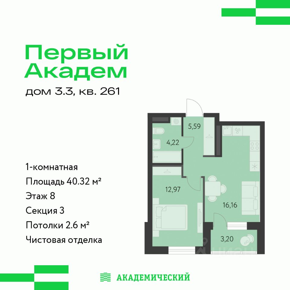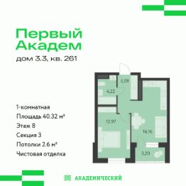 Продается 1-комнатная квартира площадью 40.32 кв.м. от девелопера "Академический" в жилом квартале "Первый Академ". Срок сдачи дома в 2028 году. Выгоды и скидка напрямую от застройщика.