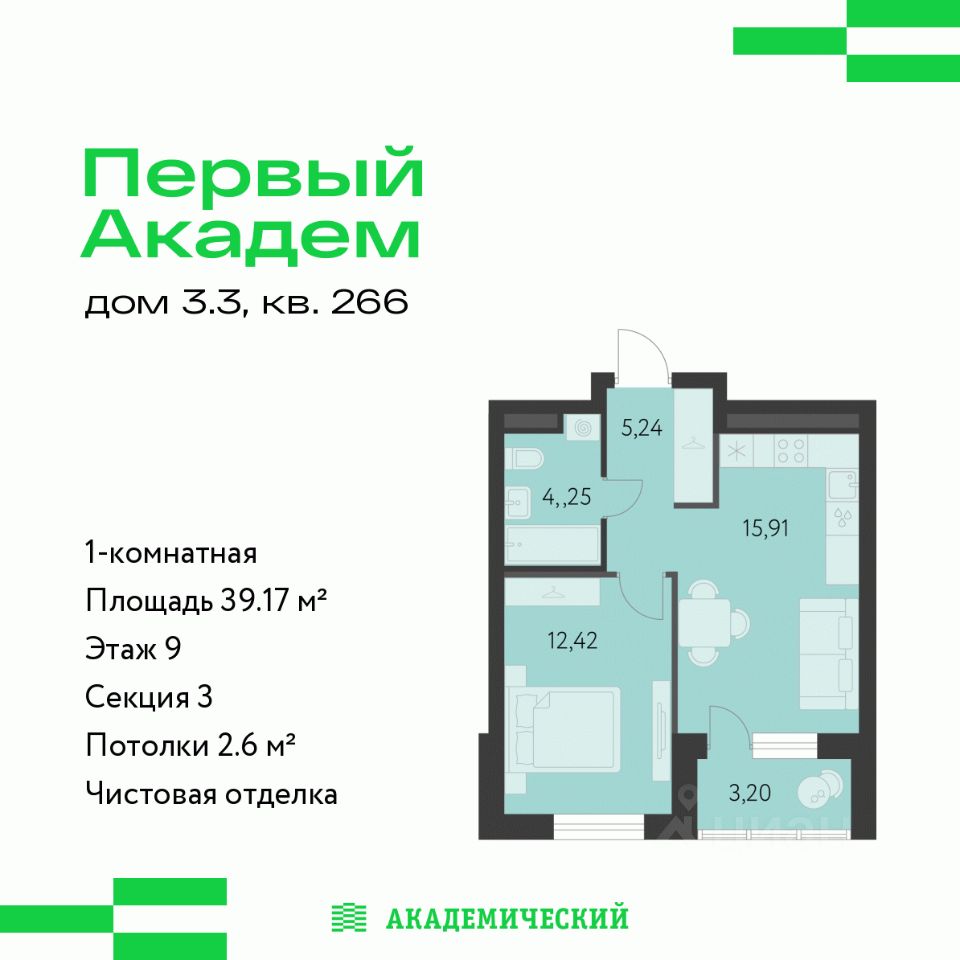 Продается 1-комнатная квартира площадью 39.17 кв.м. от девелопера "Академический" в жилом квартале "Первый Академ". Срок сдачи дома в 2028 году. Выгоды и скидка напрямую от застройщика.
