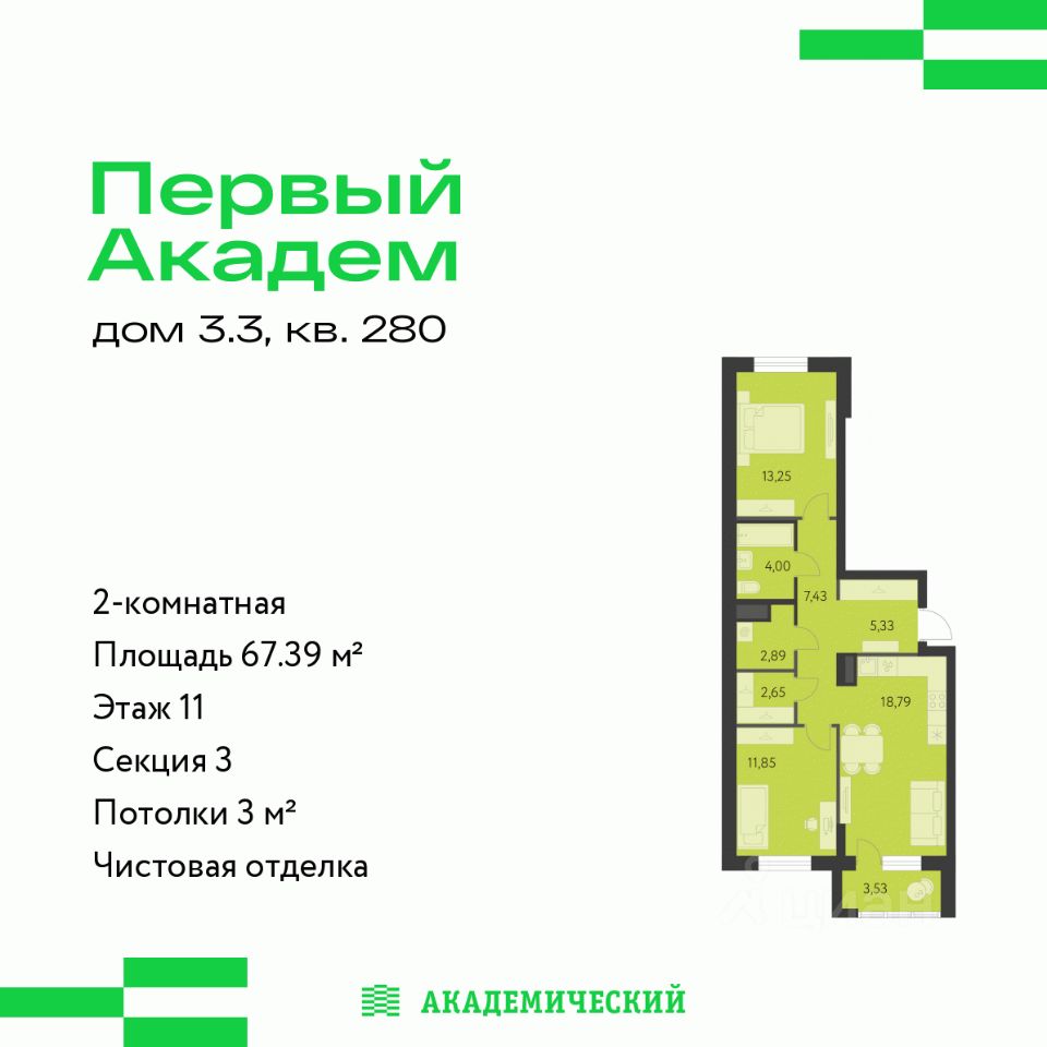Продается 2-комнатная квартира площадью 67.39 кв.м. от девелопера "Академический" в жилом квартале "Первый Академ". Срок сдачи дома в 2028 году. Выгоды и скидка напрямую от застройщика.