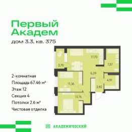 Продается 2-комнатная квартира площадью 67.46 кв.м. от девелопера "Академический" в жилом квартале "Первый Академ". Срок сдачи дома в 2028 году. Выгоды и скидка напрямую от застройщика.