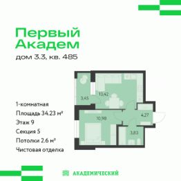 Продается 1-комнатная квартира площадью 34.23 кв.м. от девелопера "Академический" в жилом квартале "Первый Академ". Срок сдачи дома в 2028 году. Выгоды и скидка напрямую от застройщика.
