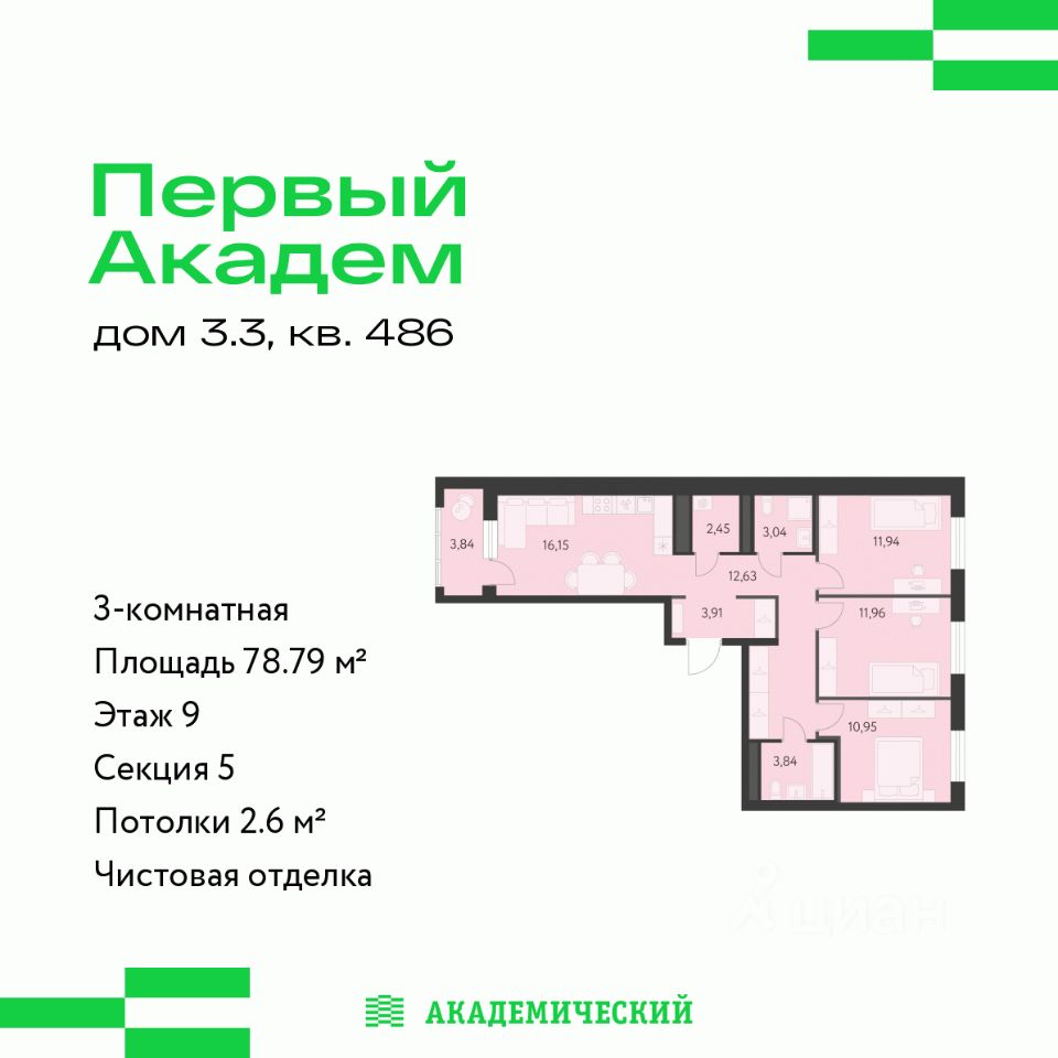 Продается 3-комнатная квартира площадью 78.79 кв.м. от девелопера "Академический" в жилом квартале "Первый Академ". Срок сдачи дома в 2028 году. Выгоды и скидка напрямую от застройщика.