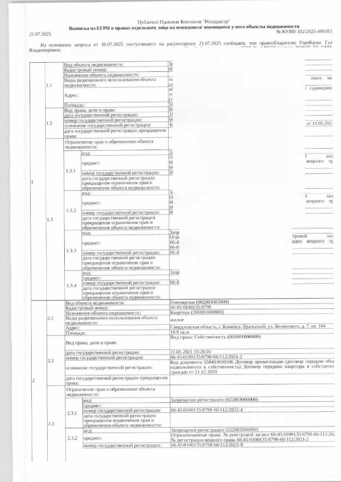 Должник: Горобцова Г.В., Собственник: Горобцова Г.В. Лот: Жилое помещение (квартира), площадь 18,9 кв.м., кадастровый номер: 66:45:0100135:8798, г. Каменск-Уральский, ул. Белинского, д. 7, кв. 104, (зарегистрированные лица - 2 взрослых), н/ц: 700000 р, з-к: 700 р, код: 0014, рег. 12-3013/25;