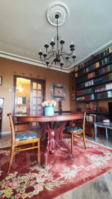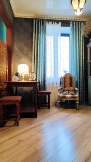 При входе в квартиру вас встречает большая прихожая с вместительным шкафом купе и восхитительной люстрой, которая никого не оставит равнодушным. Высокие распашные двери ведут в гостиную с обеденной зоной, лепниной на потолке и огромными окнами. Камерная спальня с большой кроватью и мягким светом настраивает на расслабление и хороший сон. (обои под покраску, при желании можно просто перекрасить)