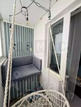 На балконе сделан ремонт - оборудована летняя зона отдыха с подвесным креслом-качелью и мягким диванчиком.