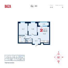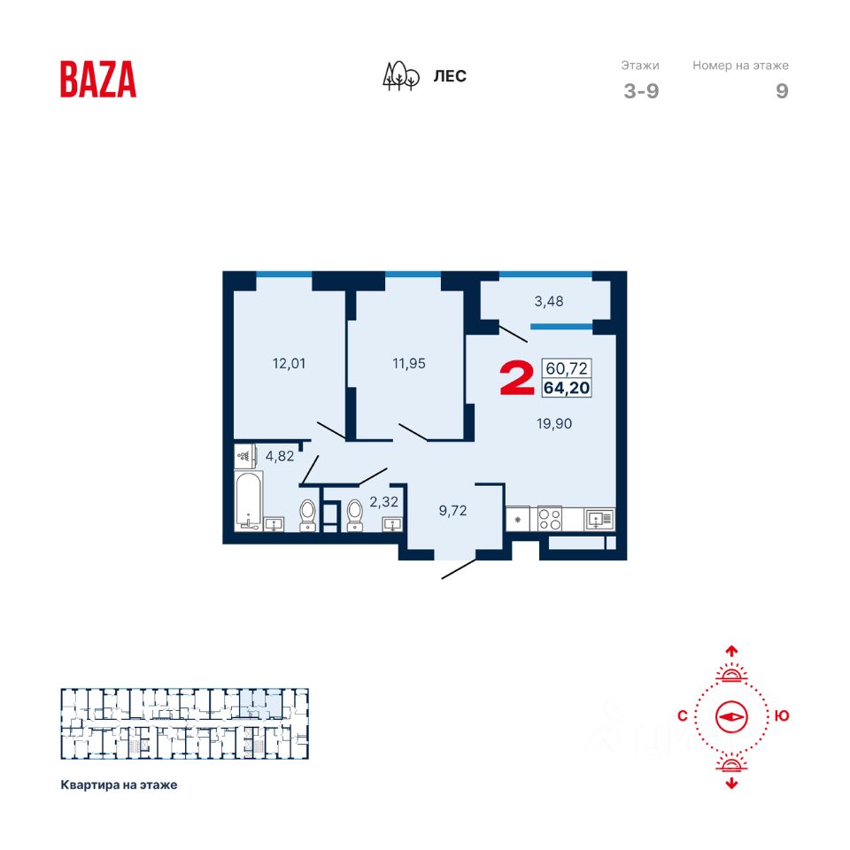 Продаётся квартира в Квартал-парк "Каменные палатки". 2-комнатная квартира, 64,05 м², 100, Очередь 4, секция 16. Стоимость указана с учетом чистовой отделки.