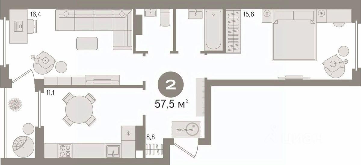 В продаже 2-комнатная квартира площадью 57.5 кв.м. расположенная по адресу: г. Екатеринбург, ул. Анатолия Мехренцева, д.46, расположенная на 7 этаже, 16-этажного дома.
