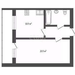 Планировка квартиры функциональна: изолированная кухня совмещена со столовой зоной, а просторная комната позволяет организовать отдельные зоны для сна и отдыха.