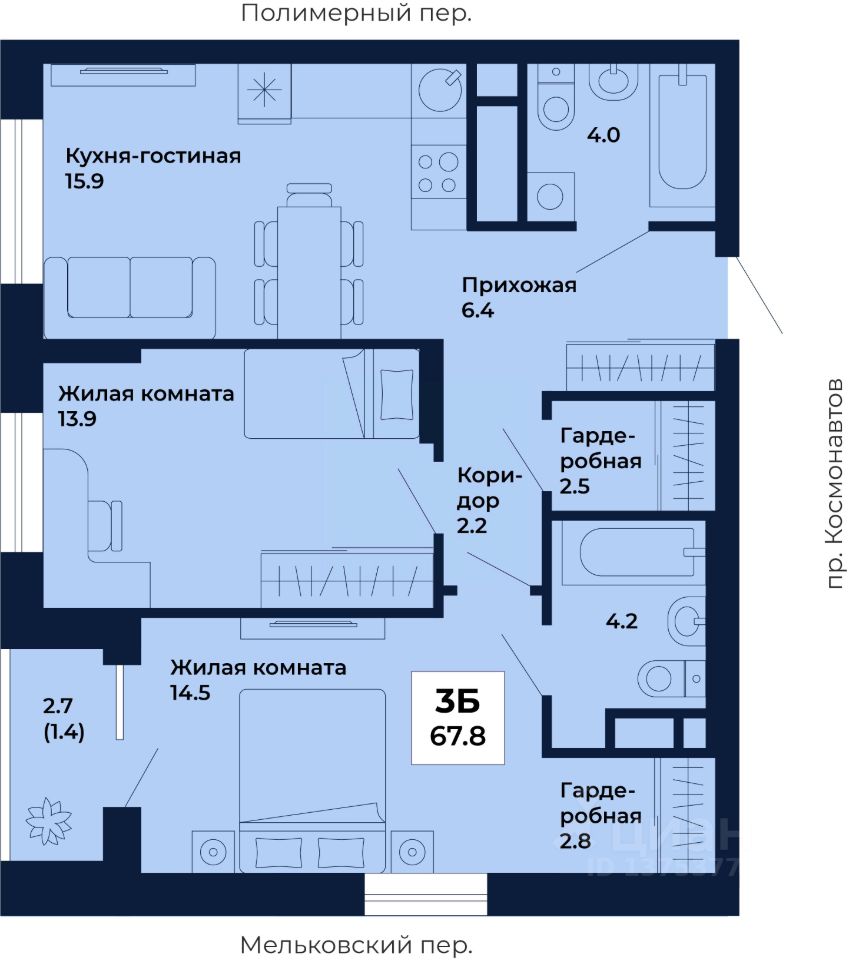 Продаётся 2-комнатная квартира в строящемся доме (Дом 8,9), срок сдачи: I-кв. 2029, общей площадью 67.8 кв.м., на 3 этаже. ЖК "Космос" - современный жилой квартал на проспекте Космонавтов 7, который строит ГК "Ривьера Инвест Екатеринбург". Жилой комплекс - это пять домов, благоустроенная территория комплекса и наземная парковка. Места общего пользования также выполнены в единой стилистике "космической" темы, используемой и в оформлении холлов, и дворов.