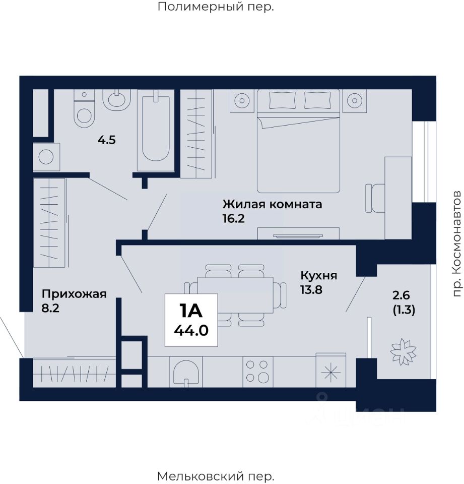 Продаётся 1-комнатная квартира в строящемся доме (Дом 8,9), срок сдачи: I-кв. 2029, общей площадью 44 кв.м., на 4 этаже. ЖК "Космос" - современный жилой квартал на проспекте Космонавтов 7, который строит ГК "Ривьера Инвест Екатеринбург". Жилой комплекс - это пять домов, благоустроенная территория комплекса и наземная парковка. Места общего пользования также выполнены в единой стилистике "космической" темы, используемой и в оформлении холлов, и дворов.