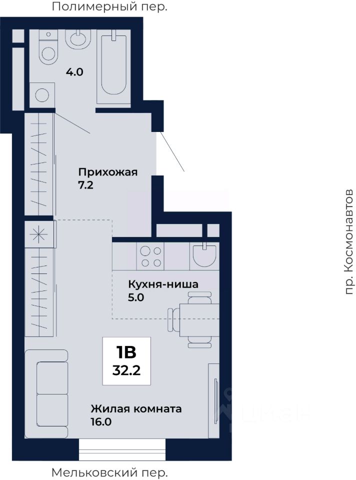 Продаётся студия в строящемся доме (Дом 8,9), срок сдачи: I-кв. 2029, общей площадью 32.2 кв.м., на 6 этаже. ЖК "Космос" - современный жилой квартал на проспекте Космонавтов 7, который строит ГК "Ривьера Инвест Екатеринбург". Жилой комплекс - это пять домов, благоустроенная территория комплекса и наземная парковка. Места общего пользования также выполнены в единой стилистике "космической" темы, используемой и в оформлении холлов, и дворов.