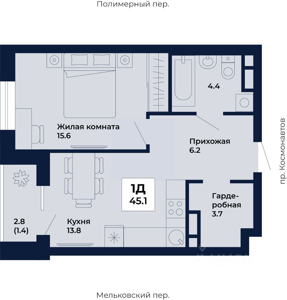 Продаётся 1-комнатная квартира в строящемся доме (Дом 8,9), срок сдачи: I-кв. 2029, общей площадью 45.1 кв.м., на 7 этаже. ЖК "Космос" - современный жилой квартал на проспекте Космонавтов 7, который строит ГК "Ривьера Инвест Екатеринбург". Жилой комплекс - это пять домов, благоустроенная территория комплекса и наземная парковка. Места общего пользования также выполнены в единой стилистике "космической" темы, используемой и в оформлении холлов, и дворов.