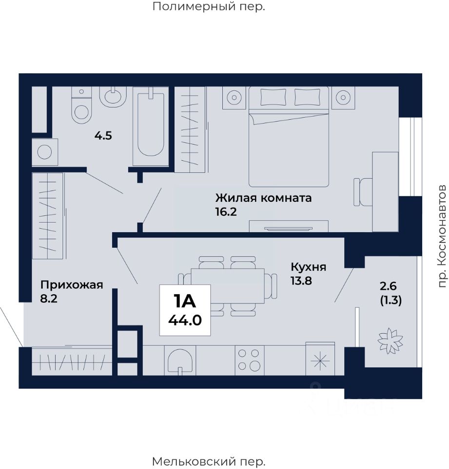 Продаётся 1-комнатная квартира в строящемся доме (Дом 8,9), срок сдачи: I-кв. 2029, общей площадью 44 кв.м., на 13 этаже. ЖК "Космос" - современный жилой квартал на проспекте Космонавтов 7, который строит ГК "Ривьера Инвест Екатеринбург". Жилой комплекс - это пять домов, благоустроенная территория комплекса и наземная парковка. Места общего пользования также выполнены в единой стилистике "космической" темы, используемой и в оформлении холлов, и дворов.