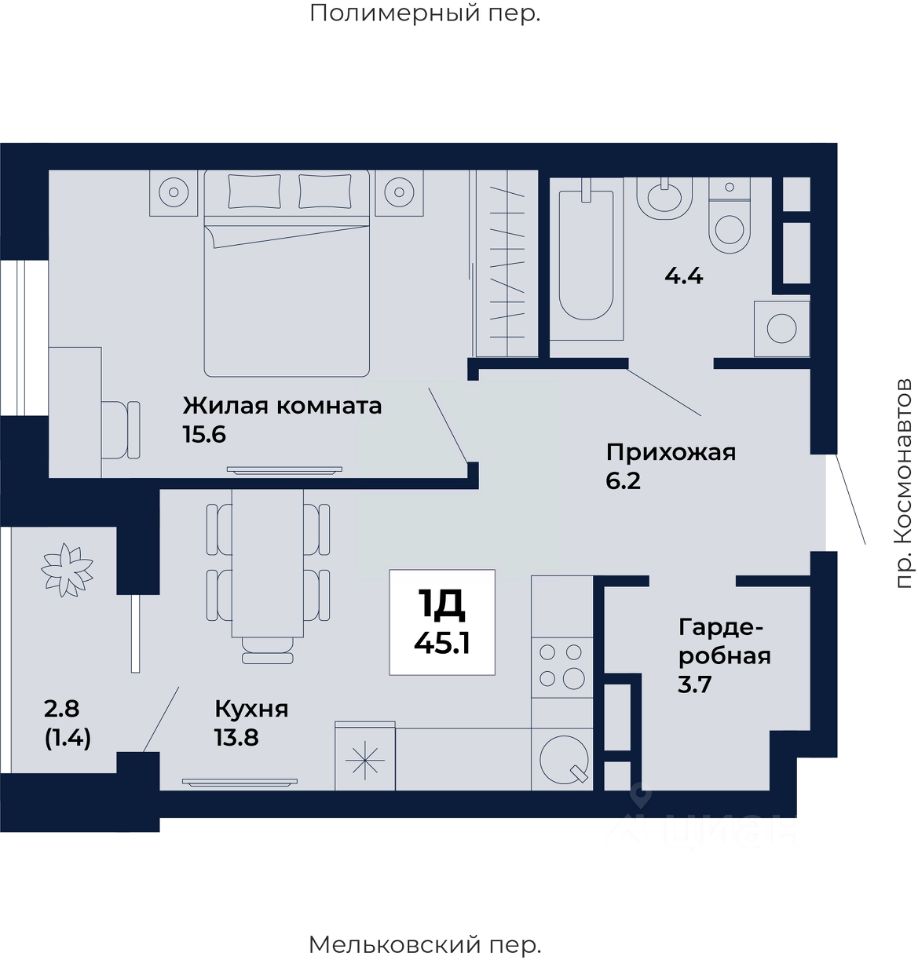 Продаётся 1-комнатная квартира в строящемся доме (Дом 8,9), срок сдачи: I-кв. 2029, общей площадью 45.1 кв.м., на 13 этаже. ЖК "Космос" - современный жилой квартал на проспекте Космонавтов 7, который строит ГК "Ривьера Инвест Екатеринбург". Жилой комплекс - это пять домов, благоустроенная территория комплекса и наземная парковка. Места общего пользования также выполнены в единой стилистике "космической" темы, используемой и в оформлении холлов, и дворов.