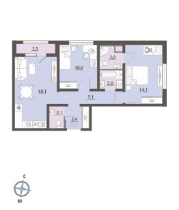 Жилая площадь 25 м2, кухня 18.1 м2, чистовая отделка. Раздельных санузлов - нет, балконов - нет, лоджий - 1.