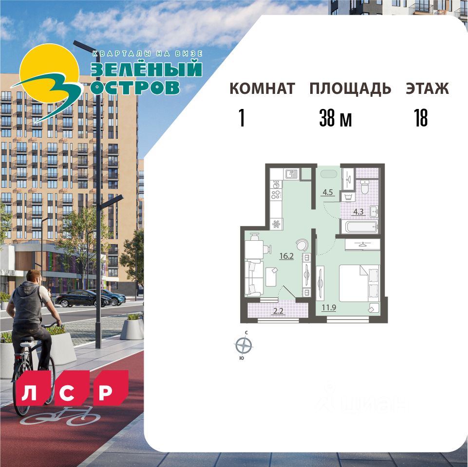 Квартира располагается на 18 этаже 25-этажного дома в ЖК Зеленый остров.