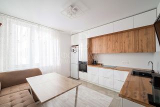 Кухня-гостиная 12,7 метров. На кухне качественный кухонный гарнитур, он остается новым владельцам, продуманы места хранения, ниши до потолка, качественная фурнитура, встроенная посудомойка, варочная поверхность, духовой шкаф, подсветка над рабочей зоной.