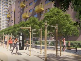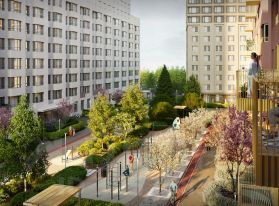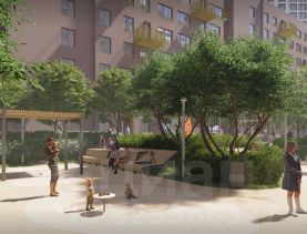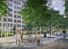 большой зеленый двор-парк с площадкой для воркаута, игровыми и прогулочными зонами;