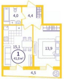 Общая площадь: 41,8 кв. м., жилая: 37,31 кв. м., площадь просторной кухни-столовой: 15,1 кв. м.