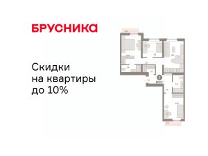 Квартира с кухней-гостиной и тремя спальнями в Бруснике в Академическом. Особенности планировки: балкон, предчистовая отделка, рабочий кабинет, разнесённые спальни.