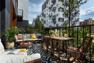 Оживлённое уличное движение останется за пределами квартала, а внутри создается собственная природная среда с зонами для вечерних прогулок, расслабленного отдыха, спорта и игр. Между домов проходит широкий пешеходный бульвар с разнообразным ландшафтом. Он объединяет общественные пространства между кварталами и переходит в площадь-сквер с фонтаном.