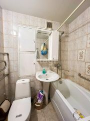 - Санузел совмещенный, с ванной, стиральной машиной и туалетными шкафчиками