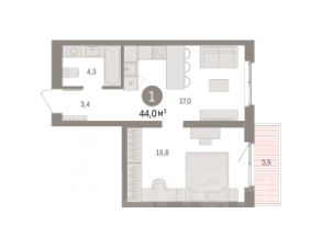 Квартира с кухней-гостиной и одной спальней в Южных кварталах. Особенности планировки: балкон, предчистовая отделка.