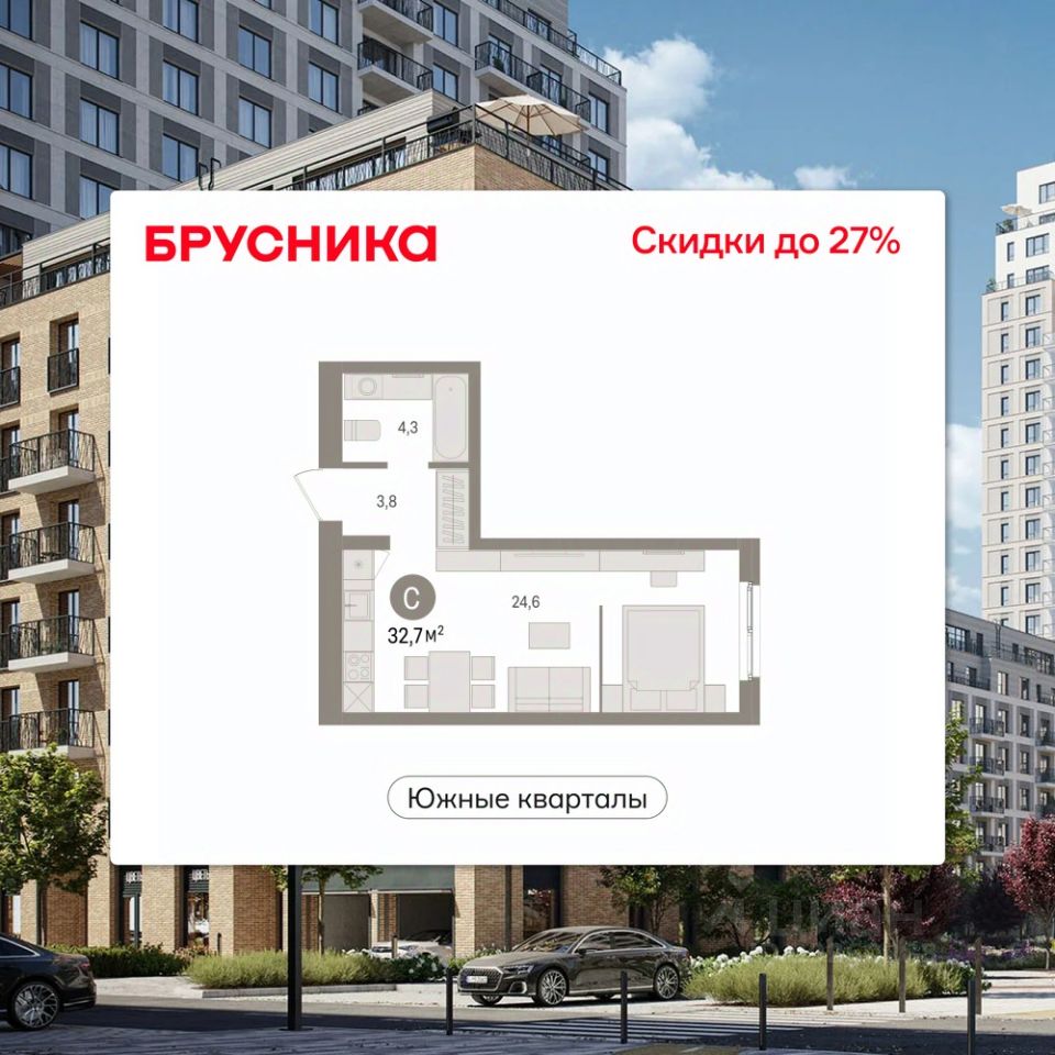 Студия в Южных кварталах. Особенности планировки: вид во двор, предчистовая отделка.