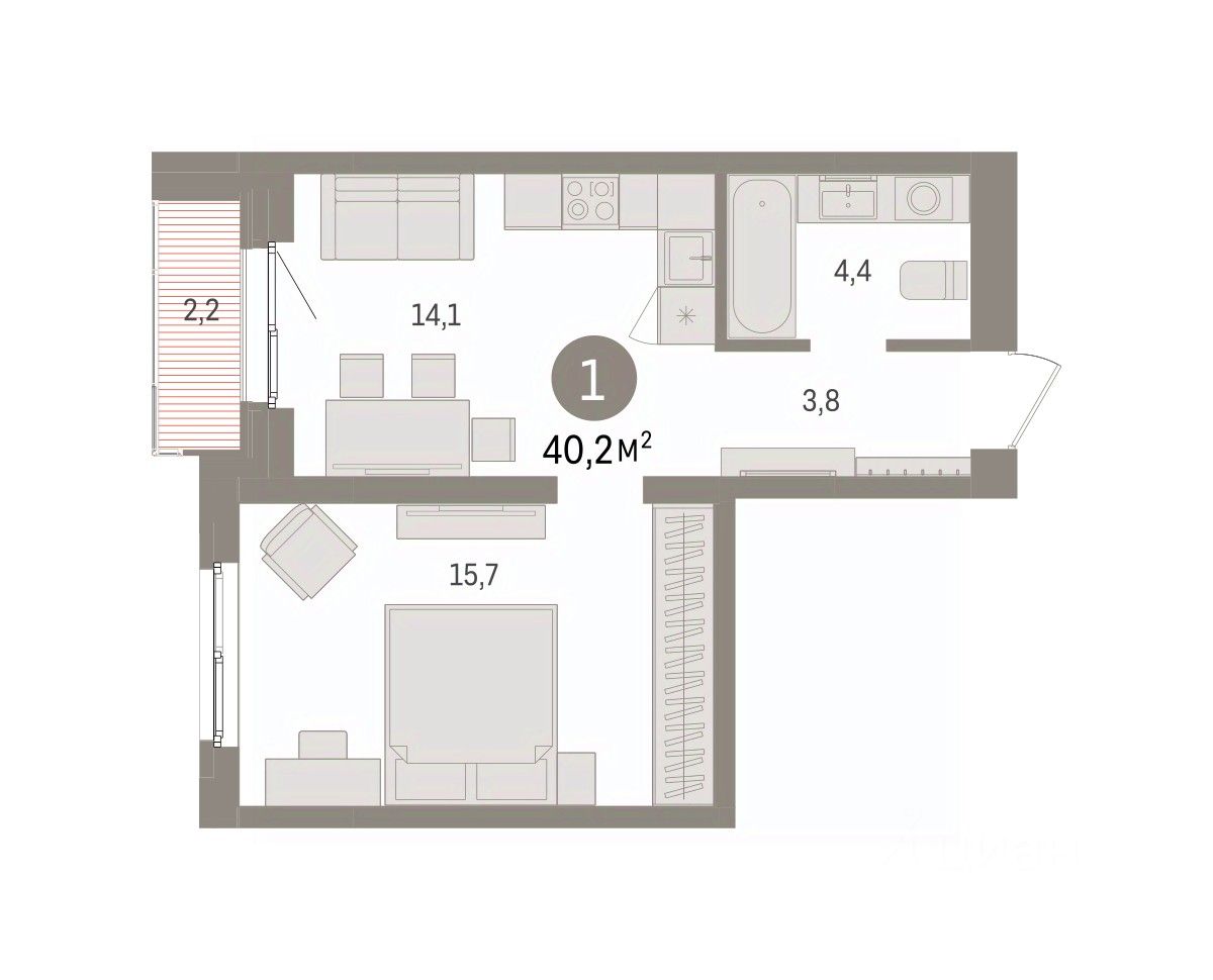 Квартира с кухней-гостиной и одной спальней в Южных кварталах. Особенности планировки: балкон, предчистовая отделка.