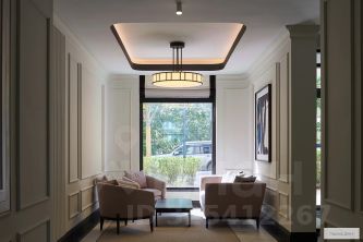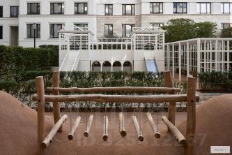 Вход во двор организован через колоннаду. Планировочно он разделён на две части. Парадный партер с большим количеством стриженых растений, фонтанами, цветущими кустарниками и более "домашняя", уютная зона, где высажены деревья и низкорослые хвойные растения, многолетники. В центре двора — две детские площадки. #ZmbdD9