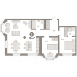 Квартира с кухней-гостиной и двумя спальнями в квартале "На Некрасова". Особенности планировки: предчистовая отделка.
