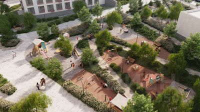 Во дворе мы отобразили все многообразие природы Урала. Игровые площадки - как подножия холмов. Центральная аллея во дворе - берег горной реки. Вокруг дома - травянистый луг с дикими тропами. Уличное кафе - пикник на природе. Между детской площадкой и зоной отдыха - небольшой ручеек, который наполняется дождевой водой. В самой гуще событий - сквер и смотровая площадка, окруженные набережной, соседским центром и кафе.