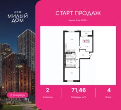 Продается 2-комн. квартира с предчистовой отделкой в ЖК "Милый дом" на 4 этаже. Общая площадь: 71.46 кв.м., жилая: 27.51 кв.м., площадь просторной кухни-столовой: 21.78 кв.м. Квартира - распашонка, без проходных комнат, окна выходят на paзные стороны дома. В квартире одна лоджия, два совмещенных санузла. Высота потолков 2.7 м.