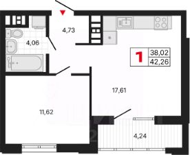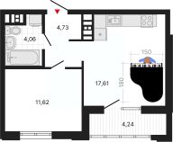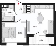 1-комн. квартира с предчистовой отделкой в ЖК "Милый дом" на 10 этаже. Общая площадь: 42.1 кв.м., жилая: 11.62 кв.м., площадь просторной кухни-столовой: 17.61 кв.м. Все окна выходят на одну сторону. В квартире одна лоджия, один совмещенный санузел. Высота потолков 2.7 м.