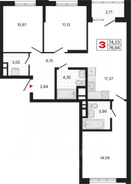 Просторная 3-комн. квартира с предчистовой отделкой в ЖК "Милый дом" на 5 этаже. Общая площадь: 76.33 кв.м., жилая: 36.39 кв.м., площадь просторной кухни-столовой: 17.37 кв.м. Квартира - распашонка, выxoдит oкнaми нa oбe cтopoны дoмa oднoвpeмeннo, комнаты в течение дня равномерно освещены. В квартире одна лоджия, два совмещенных санузла. Высота потолков 2.7 м.