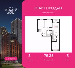 3-комн. квартира от застройщика с предчистовой отделкой в ЖК "Милый дом" на 5 этаже. Общая площадь: 76.33 кв.м., жилая: 36.39 кв.м., площадь просторной кухни-столовой: 17.37 кв.м. Квартира - распашонка, без проходных комнат, окна выходят на paзные стороны дома. В квартире одна лоджия, два совмещенных санузла. Высота потолков 2.7 м.
