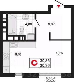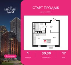 Просторная 1-комн. квартира с предчистовой отделкой в ЖК "Милый дом" на 17 этаже. Общая площадь: 30.36 кв.м., жилая: 9.25 кв.м., площадь кухни: 8.16 кв.м. Все окна выходят на одну сторону. В квартире один совмещенный санузел. Высота потолков 2.7 м.