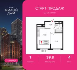 Продается 1-комн. квартира от застройщика с предчистовой отделкой в ЖК "Милый дом" на 4 этаже. Общая площадь: 39.8 кв.м., жилая: 12.38 кв.м., площадь просторной кухни-столовой: 17.63 кв.м. Все окна выходят на одну сторону. В квартире один совмещенный санузел. Высота потолков 2.7 м.