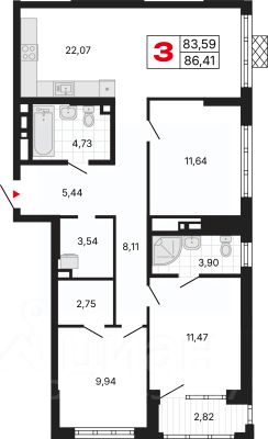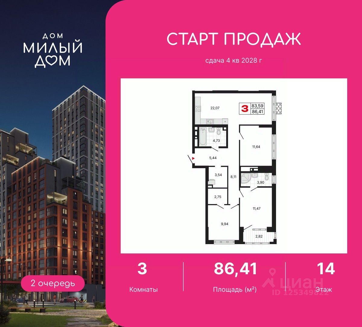Продается трехкомнатная квартира с предчистовой отделкой в ЖК "Милый дом" на 14 этаже. Общая площадь: 86.41 кв.м., жилая: 33.05 кв.м., площадь просторной кухни-столовой: 22.07 кв.м. Угловая квартира, очень светлая, естественная вентиляция при открытии окон. В квартире одна лоджия, два совмещенных санузла. Высота потолков 2.7 м.