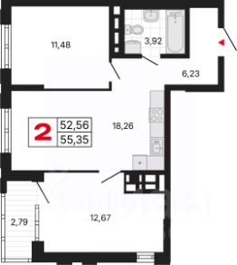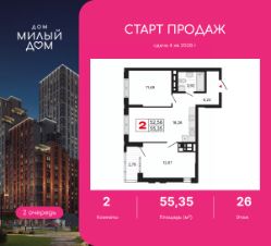Продается 2-комн. квартира с предчистовой отделкой в ЖК "Милый дом" на 26 этаже. Общая площадь: 55.35 кв.м., жилая: 24.15 кв.м., площадь просторной кухни-столовой: 18.26 кв.м. Угловая квартира, очень светлая, естественная вентиляция при открытии окон. В квартире один совмещенный санузел. Высота потолков 2.7 м.