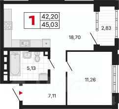 1-комн. квартира от застройщика с предчистовой отделкой в ЖК "Милый дом" на 28 этаже. Общая площадь: 45.03 кв.м., жилая: 11.26 кв.м., площадь просторной кухни-столовой: 18.7 кв.м. Все окна выходят на одну сторону. В квартире одна лоджия, один совмещенный санузел. Высота потолков 2.7 м.