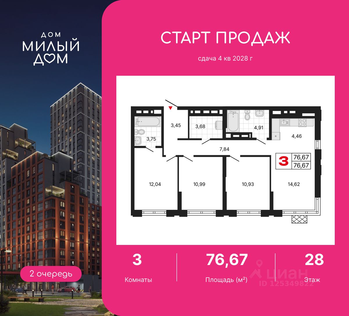 Продается 3-комн. квартира от застройщика с предчистовой отделкой в ЖК "Милый дом" на 28 этаже. Общая площадь: 76.67 кв.м., жилая: 33.96 кв.м., площадь просторной кухни-столовой: 19.08 кв.м. Квартира угловая, идеально подойдет любителям тишины и панорамных видов. В квартире два совмещенных санузла. Высота потолков 2.7 м.