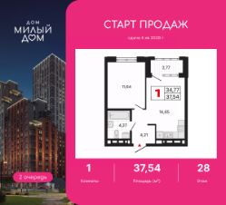 Однокомнатная квартира с предчистовой отделкой в ЖК "Милый дом" на 28 этаже. Общая площадь: 37.54 кв.м., жилая: 11.64 кв.м., площадь просторной кухни-столовой: 14.65 кв.м. Все окна выходят на одну сторону. В квартире одна лоджия, один совмещенный санузел. Высота потолков 2.7 м.