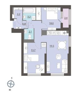 Жилая площадь 23.1 м2, кухня 19.9 м2, чистовая отделка. Раздельных санузлов - нет, балконов - нет, лоджий - 1.