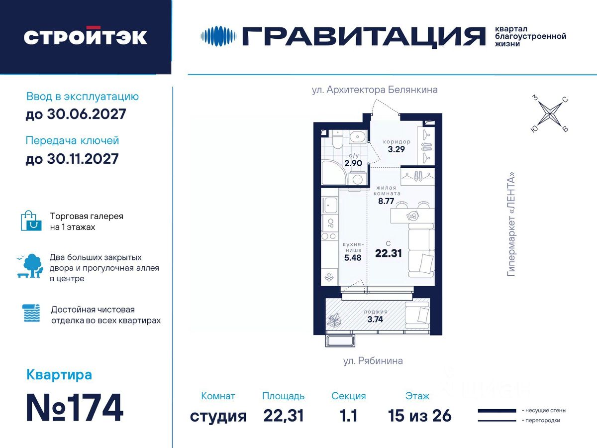 Удачные решения Новый квартал благоустроенной жизни "Гравитация" мы разместили в периметре улиц Рябинина и Академика Ландау. У квартала 5 этапов строительства, а всю работу мы завершим к 2030 году. Авторы проекта гармонично совместили в оформлении природные элементы и современный дизайн. Волнообразные очертания на стенах вдохновлены силой ветра и движением воды. Скруглённые углы подчеркивают элегантный силуэт, а контрастная палитра акцентов и контурная подсветка верхних этажей создают выразительный архитектурный образ. Первый этап строительства: — Секция 1.1 — 1 подъезд 26 этажей — Секция 1.2 — 2 подъезда 16 этажей — Секция 1.3 — 1 подъезд 12 этажей Здесь всё и сразу Гравитация — уютный и обособленный, и в то же время открытый и просторный квартал. Всё рядом: супермаркеты и парки, кино и рестораны, школы и сады. В нескольких шагах набережная реки Патрушихи. В квартале построят муниципальный детский сад на 200 мест, а на 5 этапе строительства мы возведём 6-уровневый надземный паркинг на 250 машин. На первых этажах домов для вас будет работать торговая галерея с магазинами, кафе и привычными бытовыми сервисами. В 1 этапе строительства 631 квартира. Своя вселенная Развитый Академический район удобен и молодым семьям, и школьникам, и состоявшимся профессионалам. Рядом большой Преображенский парк с озером и Юго-Западный лесопарк с Тропой здоровья. — 3 минуты до Гипер Ленты — 10 минут на машине до ТРЦ "Академический", 15 минут до ЕКАД, 25 до центра — 6 школ и 6 детских садов — Спортивные комплексы и клубы Wake up, Bright Fit и Юность Богатые возможности В квартале два просторных закрытых двора общей площадью 1,4 гектара. Один двор объединяет 1 и 2 этапы строительства, другой — 3, 4 и 5 этапы. Между дворами — камерная прогулочная аллея для неспешных вечеров или полуденного отдыха. Во дворе первого этапа — зелёные участки из хвойных деревьев, акцентных кустарников и травянистых многолетников, а также сеть дорожек, детская площадка с песочницей, аттракционами и геопластикой, настольный теннис и зона для зарядки. А для комфорта и безопасности — вечернее освещение, охрана и постоянное видеонаблюдение. Пространство с заботой В просторных светлых лобби Гравитации — интеллигентный дизайн, помещения для колясок, высокие витражи и комфортная мебель. Выходы сквозные, на улицу и во двор. Лифты грузоподъёмностью 1000 и 450 кг. Мы подготовили для вас 44 уникальных варианта продуманных планировок, в том числе с кухнями-гостиными, гардеробными и мастер-спальнями. Здесь нет бесполезных зон, зато есть где посидеть в семейном кругу и разместить всё для удобства и комфорта. Современные технологии Мы позаботились о достойной чистовой отделке, чтобы вы могли уделить время главному. — Виниловые обои на флизелиновой основе, окрашенные стены в санузлах и на лоджиях — Натяжные потолки везде, кроме лоджий, там — окрашенные — Прочный влагостойкий ламинат и керамическая плитка — Межкомнатные двери светлых тонов и сейф-дверь на входе — Эргономичное размещение розеток и выключателей