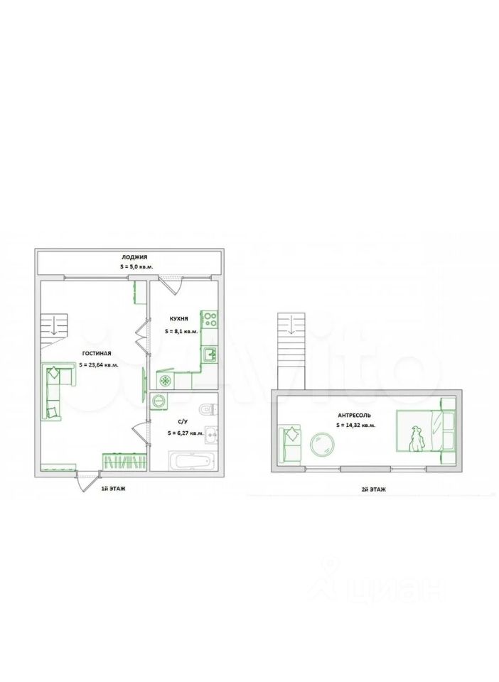 Плoщадь 53 кв м, просторная гостиная 23 кв м, кухня 8 кв м, втoрой этаж - 14 кв м, идeaльнo для кaбинeтa или спальни, застеклённый балкон 5 кв м.